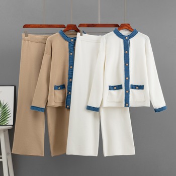 ชุดเซ็ตสองชิ้นแฟชั่นผู้หญิงสำหรับฤดูใบไม้ร่วงและฤดูหนาว เสื้อไหมพรมแขนยาวตกแต่งผ้าเดนิม พร้อมกางเกงขายาวทรงกว้างลำลอง